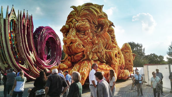 For the annual flowerparade of Zundert I designed this baroque lion. The lushness of the baroque ornaments combined with the king of the cats made this eccentric lion even more majestic. In this particular sculpture I strived for a monumental impact combined with reverence for the sleeping giant.